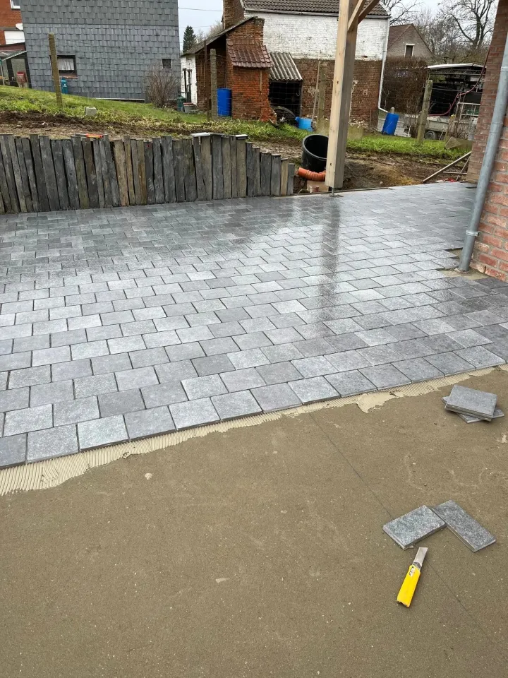 À Huy et dans la région hutoise, les terrains présentent souvent des dénivelés, notamment à proximité de la Meuse et dans les quartiers résidentiels en hauteur. Green Concept maîtrise ces contraintes : préparation rigoureuse du fond de forme, gestion des pentes d'évacuation des eaux, reprise des niveaux et finitions soignées.